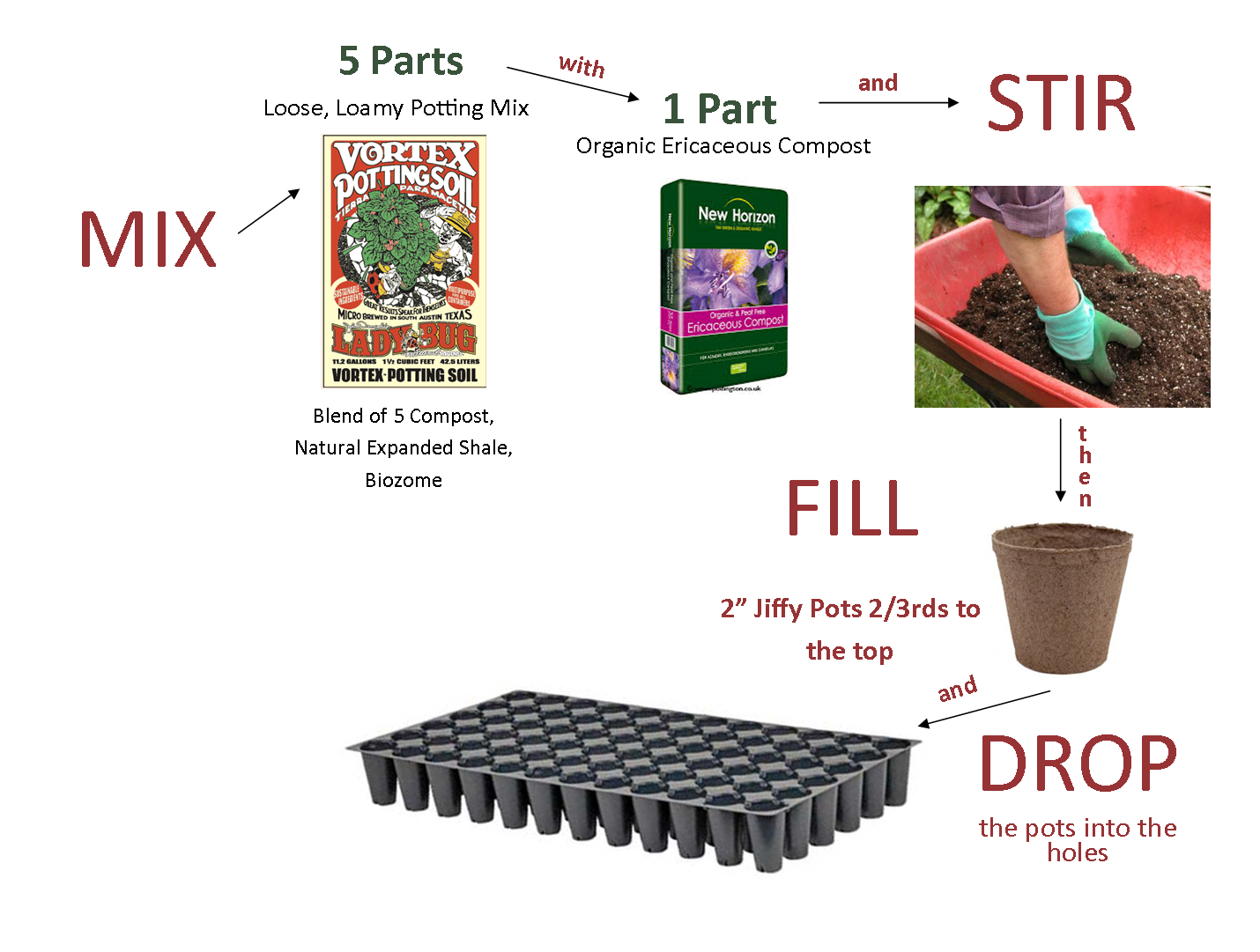 Mixing 5 parts of a good quality loose and loamy potting mix with 1 part organic ericaceous compost and loosely stuff 2" Jiffy Pots about two-thirds full. And place into a Seeding Propagation Tray.